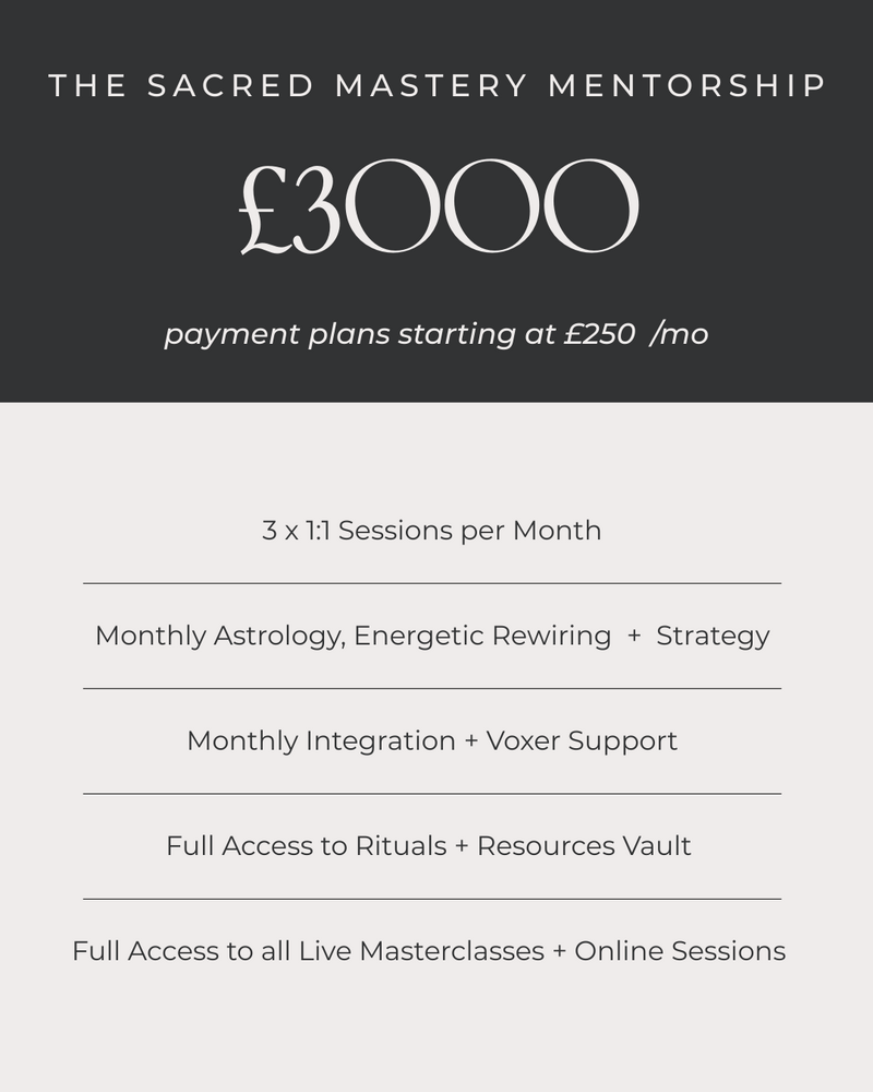 For the duration of your mentorship you will get an all access pass to my full library of courses, masterclasses, rituals & spiritual business resources. (Value £999)